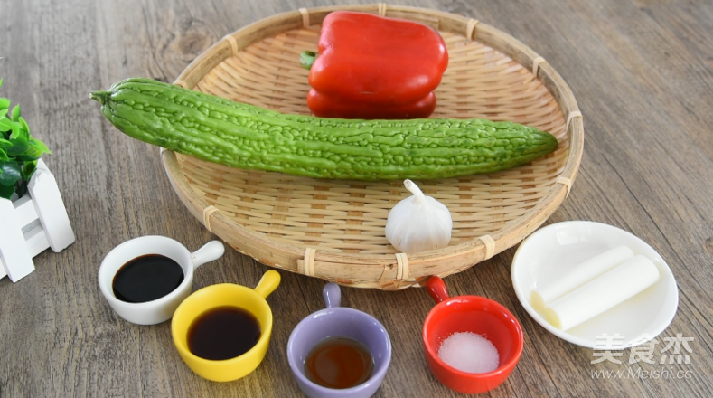 苦瓜 1根、紅椒 半個、蒜 10g、圓蔥 5g