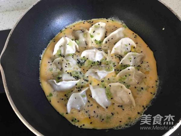 將打好的雞蛋液倒入鍋中,蓋鍋小火繼續煎至蛋液凝固。(蛋液里可以加少許鹽,依個人口味而定,我偏清淡沒加鹽,餃子本身有咸淡味,或者出鍋食用時蘸料食用)