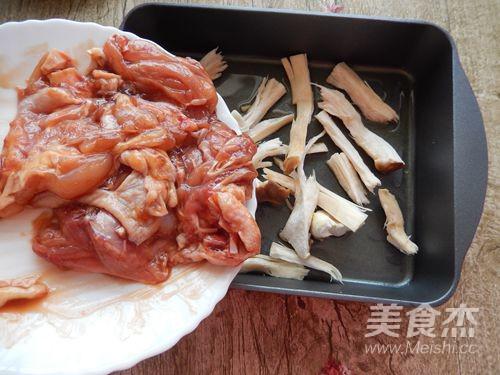杏鮑菇撕細條,烤盤涮橄欖油,擺上杏鮑菇,放上雞腿。