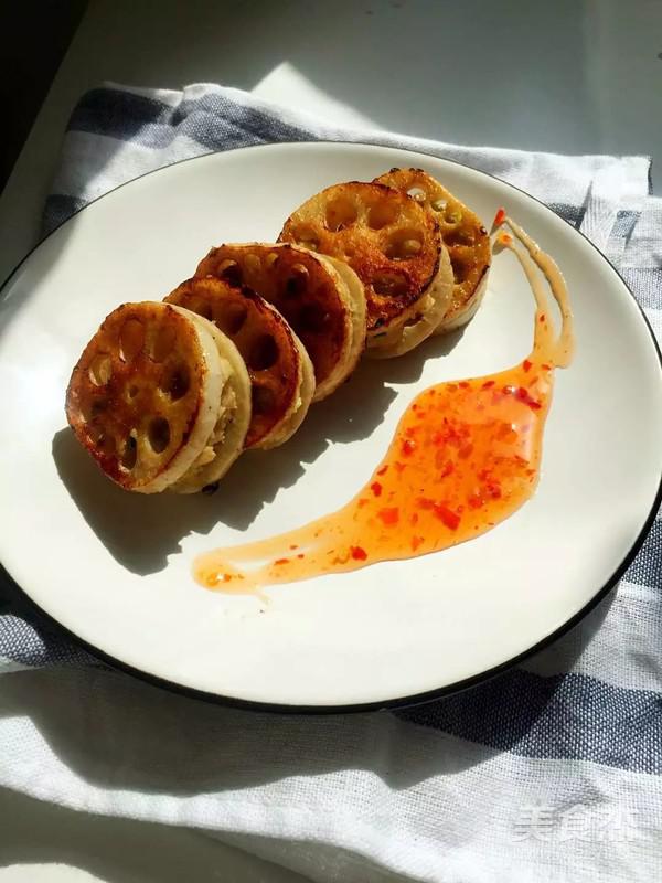 平底鍋內倒入適量的油,把做好的藕盒放入,小火煎到一面金黃,再翻另一面煎到金黃就可以