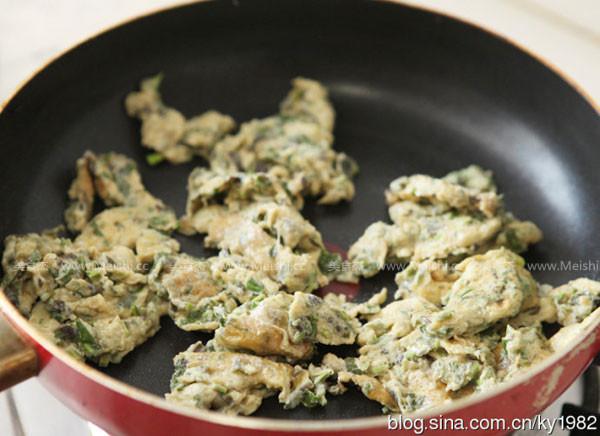 4.鍋內入植物油燒至7分熱,將香椿蛋液倒入鍋中