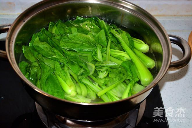 煮鍋放入清水5克食鹽和3滴香油煮開鍋放進油菜。