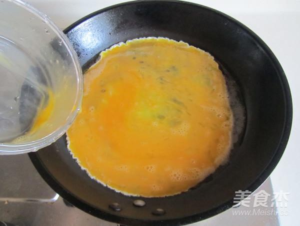 熱鍋涼油,倒入雞蛋液, 煎至定型;