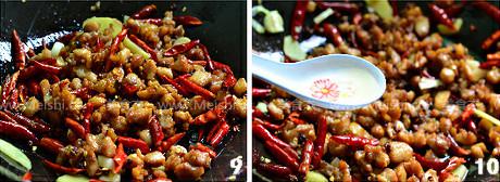 11.炒至雞肉香酥油亮時,加入白糖、香油炒勻