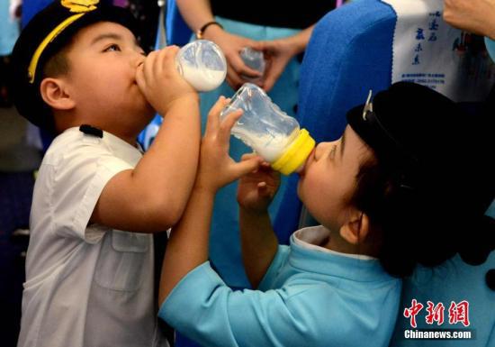 資料圖:“小機長”和“小空姐”用牛奶干杯。 王東明 攝