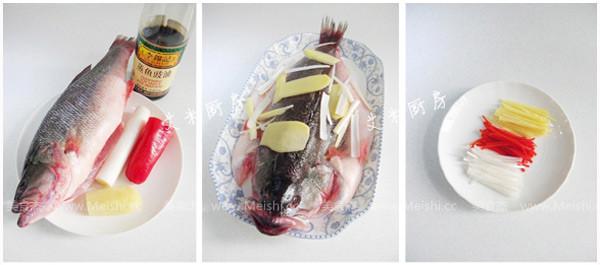 1.鱸魚去鱗去腮去內臟后洗凈瀝水,把魚的尾部片開一點,讓魚趴在盤中,放上姜片和蔥段(這里用的是蔥芯)
