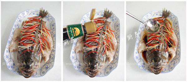 5.將切好的蔥姜絲和紅椒絲鋪在魚身上,淋上蒸魚豉油,澆上燒至微微冒煙的熱油就可以了