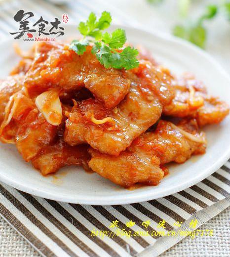 11.倒入之前做好的番茄醬汁快速炒勻,使每片肉都被醬汁包裹住,放雞精調味,再放入蒜片