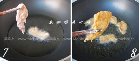 7.炒鍋倒入約500克植物油,燒至六七成熱時,將裹好糊的肉片一片片放入油鍋中