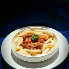 剪刀面團成較硬性的面團,多次醒面和餳面揉成較硬性的面團,在剪成剪刀面就可以了。\n剪刀面在羊排湯中寖泡一會口感更好。\n因為是山羊排所以用高壓鍋壓氣,熟的較透。