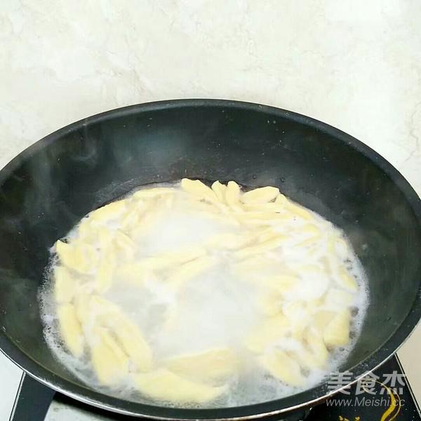14.開始制作剪刀面,鍋中水燒至冒泡,用剪刀把面團剪成菱形狀,調入2克鹽,入鍋煮5分鐘。