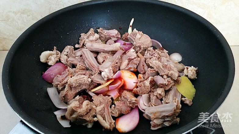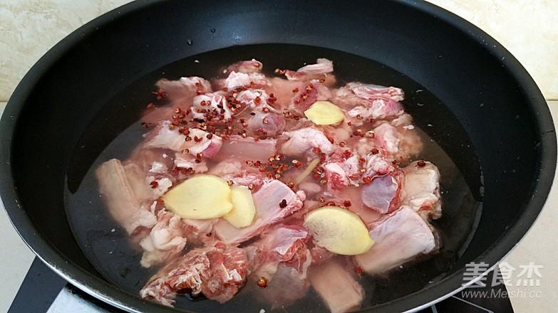 5.鍋中注入涼水,放入羊排,花椒粒,姜片煮開戳水去除雜質。