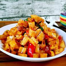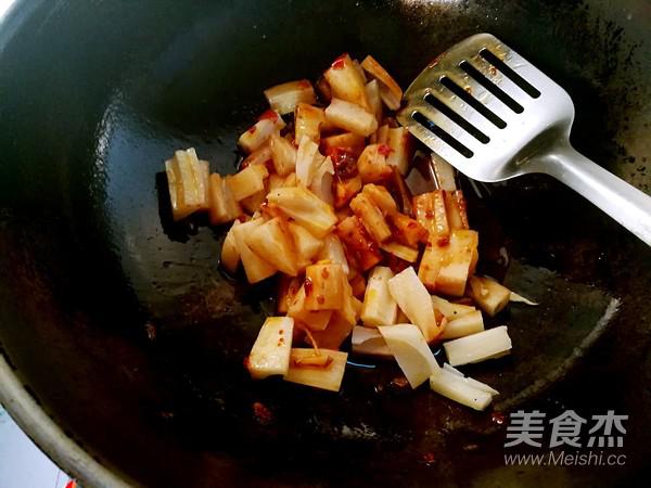 下入藕條大火翻炒入味接著加入兩勺米醋攪拌均勻