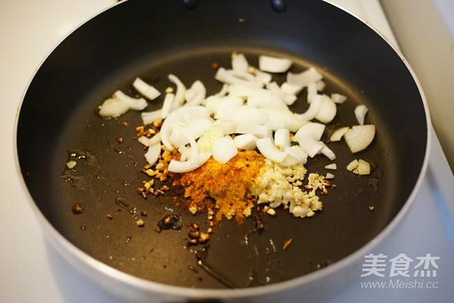 4.鍋入油,中火燒熱,加入姜蒜沫,切好的洋蔥,咖喱粉和辣椒粉炒一分鐘