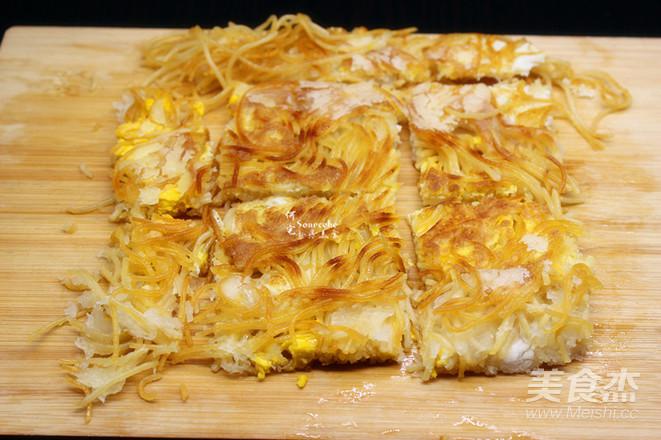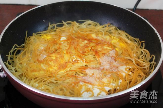 6.鍋中少許油,放入拌過橄欖油的意面,把調(diào)均的雞蛋淋在意面上面