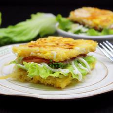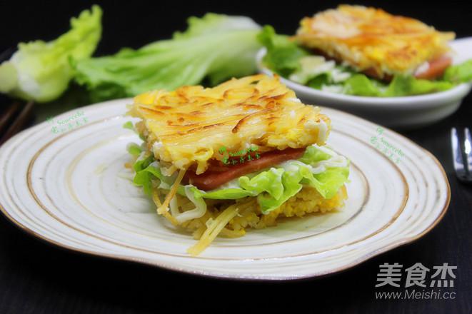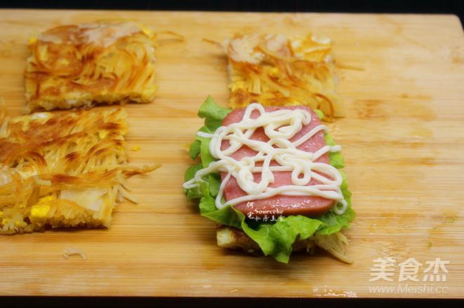 9.切好的意面塊,放上生菜、煎好的火腿、再配上蛋黃醬,放入最后放一塊意面即可。
