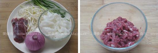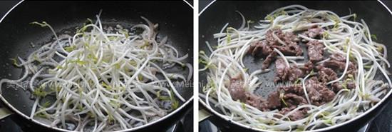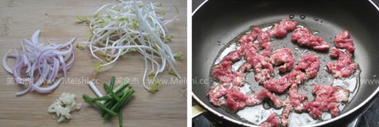 4.炒鍋加入適量植物油,下蒜末、洋蔥絲和綠豆芽炒至斷生,放入牛肉