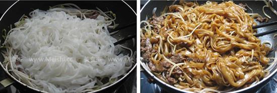 5.再放河粉一起翻炒,調(diào)入老抽和剩余的生抽、鹽,翻炒均勻,最后放入蔥段,翻炒幾秒鐘即可出鍋