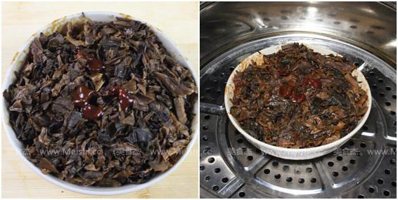 7.找一個碗,肉皮朝下碼好,然后把泡好的梅菜擠干水放在上邊弄整齊了,如果還有剩下的汁醬就全澆上去