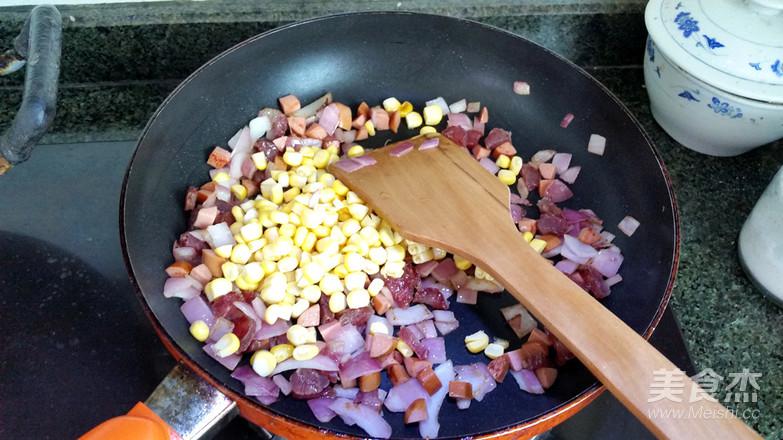 7.把玉米和脆皮腸也倒進(jìn)鍋里一起翻炒,炒得差不多就放些鹽和糖調(diào)味。