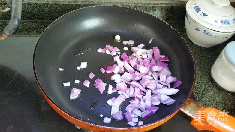9.翻炒一分鐘左右就倒入淡奶油,繼續(xù)翻炒,使每粒飯都沾有淡奶油即可。