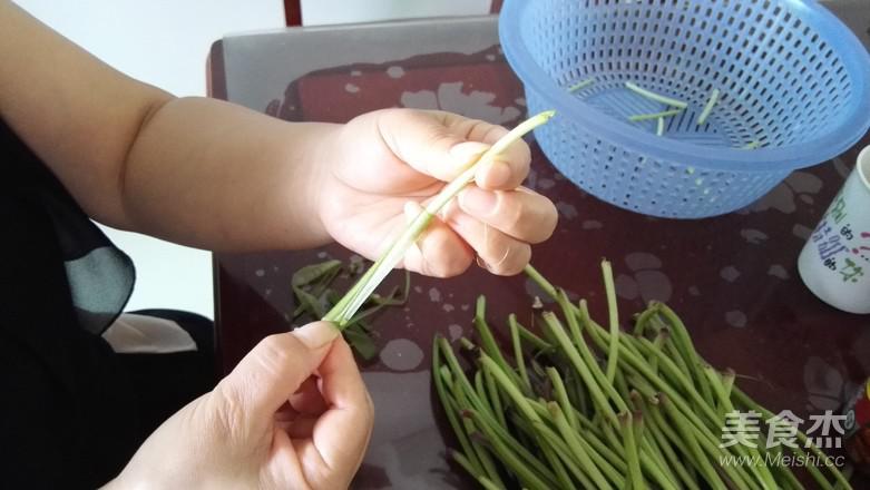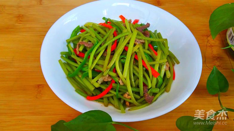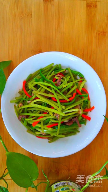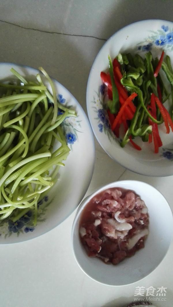 青紅椒切絲,肉絲加入料酒,鹽腌制20分鐘,紅薯梗洗凈