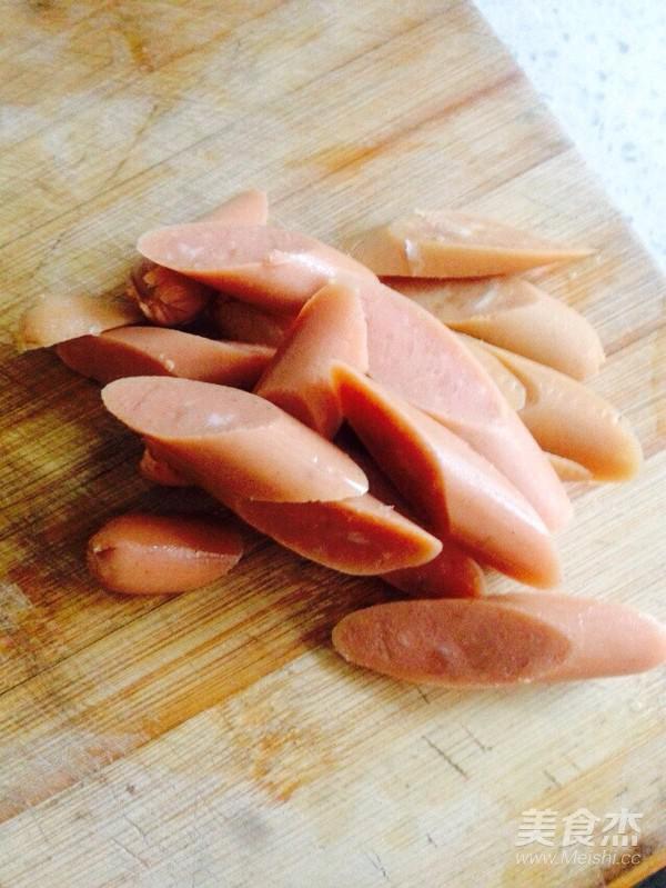 加入火腿腸和菠蘿翻炒均勻,最后加入食鹽調味