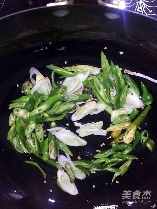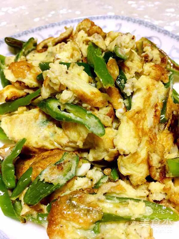 4.辣椒和蔥一起下鍋,翻炒10秒,加雞蛋液;