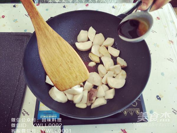 5.倒入醬油、低度白酒(此處不用加水),大火燒開后轉小火,蓋鍋蓋煮至湯汁粘稠,杏鮑菇很容易熟,蓋上蓋燜煮5分鐘。