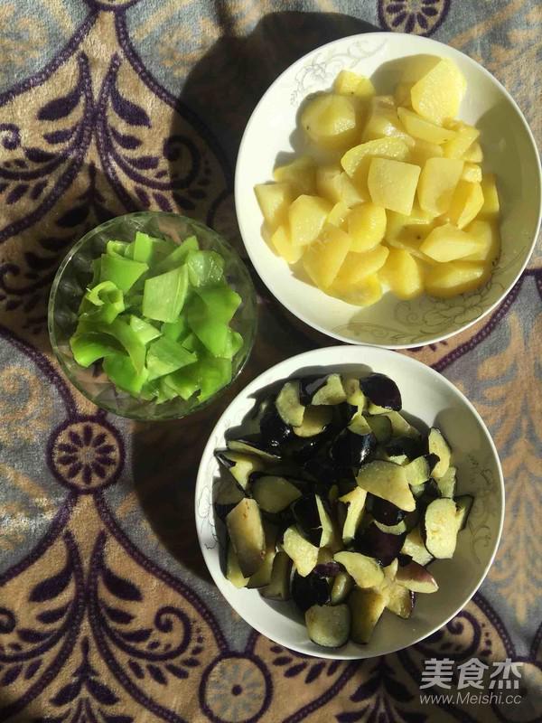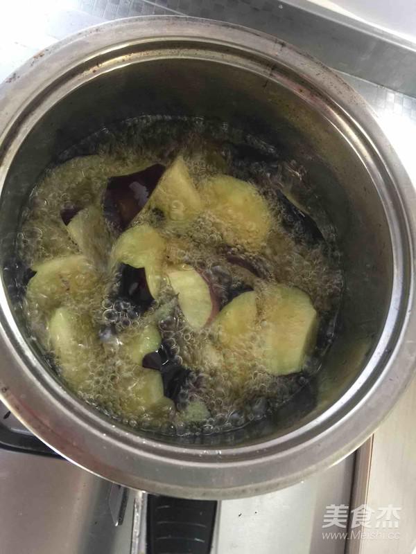 鍋里放適量油,將茄子和土豆炸一下,茄子體積變小,土豆變黃即可,尖椒也略炸一下