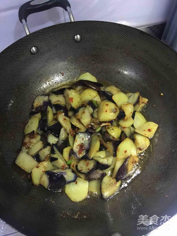 放豆瓣醬炒出紅油,然后放入土豆和茄子,翻炒均勻