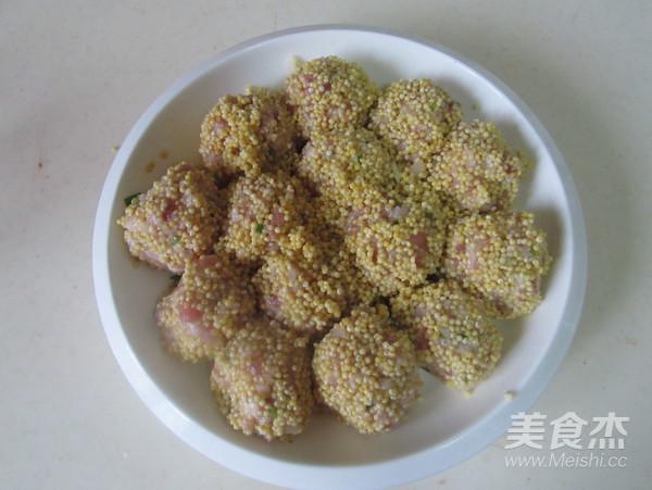 1. 小米先放入水中泡上一個小時; 2. 肉丸中加入點鹽等調味料順著一個方向攪拌上勁, 再放入蓮藕末攪拌拌均勻,再加入點鹽調味; 3. 將蓮藕肉丸均勻的裹上小米, 放在鍋上, 大火蒸上20分鐘即可。