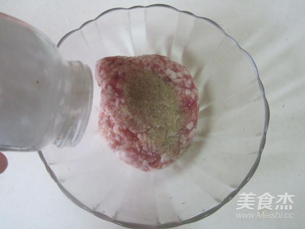 2.肉餡中加入適量的鹽、胡椒粉和料酒等調味料, 順著一個方向攪拌上勁;