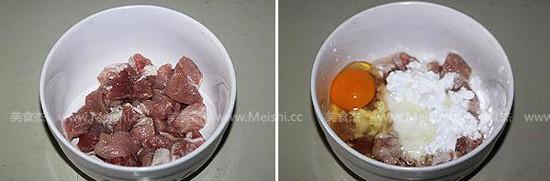 3.讓肉都裹上淀粉糊,淀粉糊要稠一些,不易流動(dòng)的狀態(tài)最好
