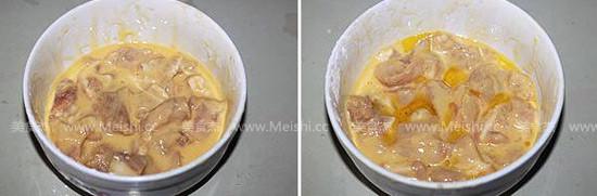 6.給肉上漿的時(shí)候就將鍋里倒入油燒熱,油燒到扔一塊肉能馬上浮起來的狀態(tài),將肉逐塊放入油鍋中