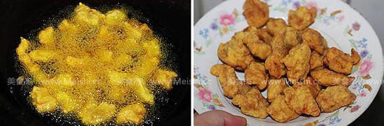 11.再放入炸好的肉塊大火快炒幾下,將肉塊裹上番茄汁即可
