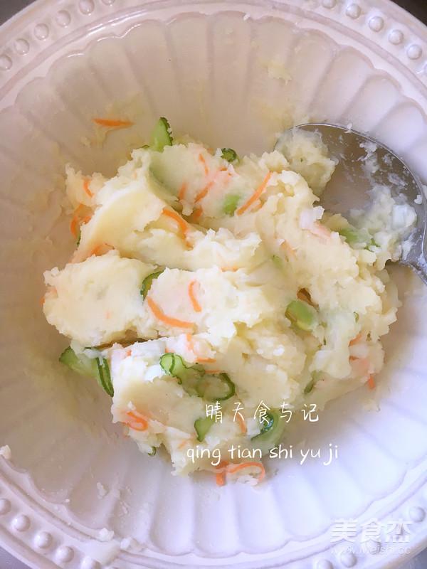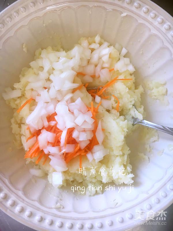 將胡蘿卜和洋蔥攥出水分后放到土豆泥中拌勻;
