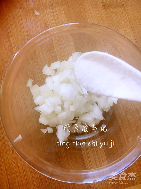 洋蔥切粒后放一點點鹽腌制一會兒;