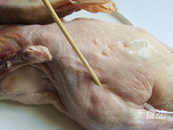 2.先用竹簽將鴨子扎一扎,這樣可以腌漬更容易入味和烘烤