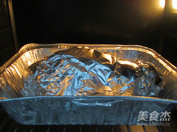 9.待表面的水稍稍瀝干后,放入預熱160度的烤箱,烤制1小時,注意先將整個鴨子用錫紙覆蓋著烤,烤制30分鐘左右取下錫紙接著烤