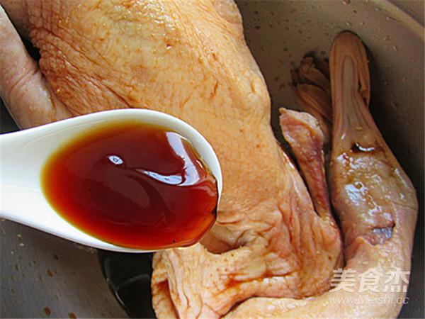 3.用一個大點的盆,放入鴨子,用料酒、醬油將鴨子全身擦個遍