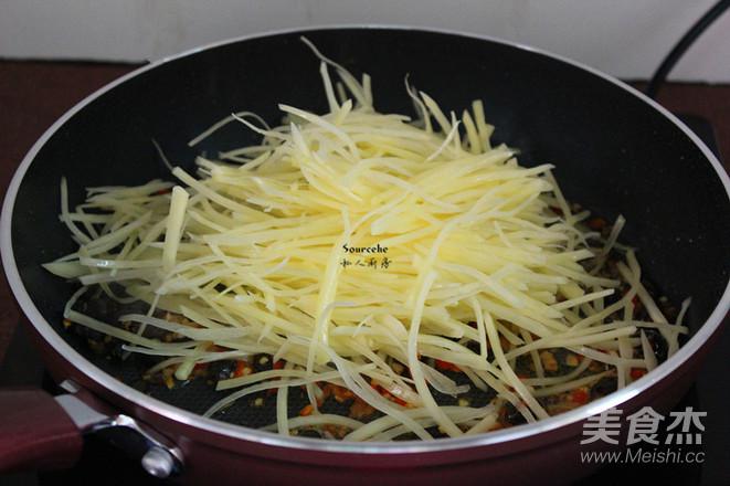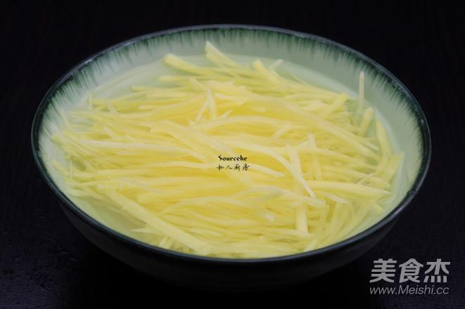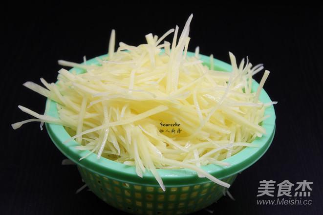 土豆去皮,洗凈,切絲(越細越長越好,),清水放鹽浸泡5分鐘 ;PS:刀工不好的,可以用刨子。