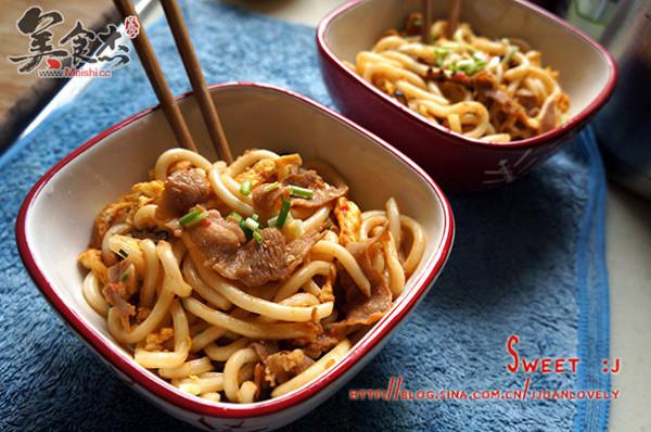 6.倒入備用的烏冬面,快速翻炒