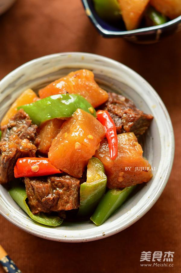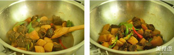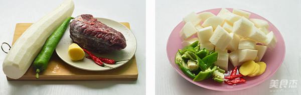 材料準備好:牛腩洗凈,姜、青椒切片,蘿卜切塊,干辣椒切段