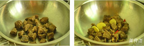 鍋里放植物油,將牛肉放入煸炒一會;放姜、干辣椒、八角、香葉炒香