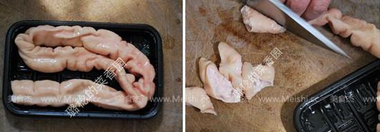 1.將買回來的豬大腸用面粉、醋反復搓洗,再用清水沖洗數次,里面的肥油不要去掉,肥腸好吃不好吃全靠它,切成小段