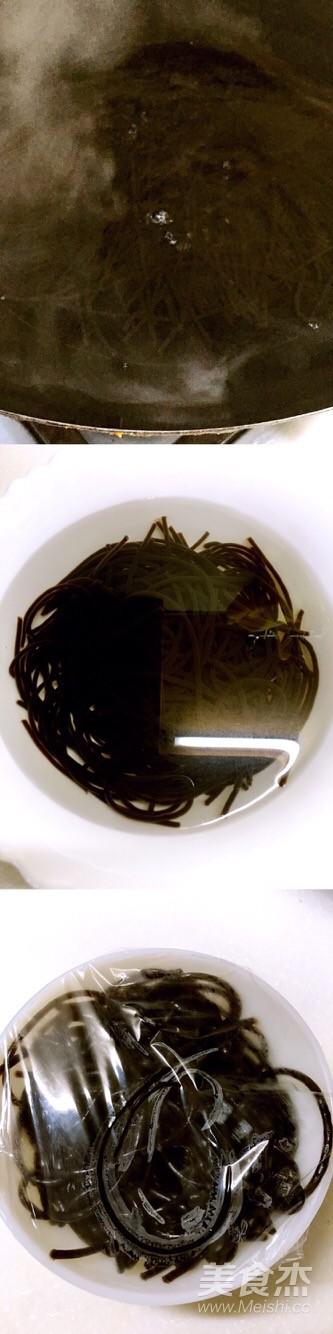 鍋中放入水,燒開后,將蕨根粉放入煮大約5至8分鐘,待粉條煮透,撈出放入涼開水中,過下水,再撈出瀝干,用保鮮膜封好,放在冰箱中冷藏一小時。