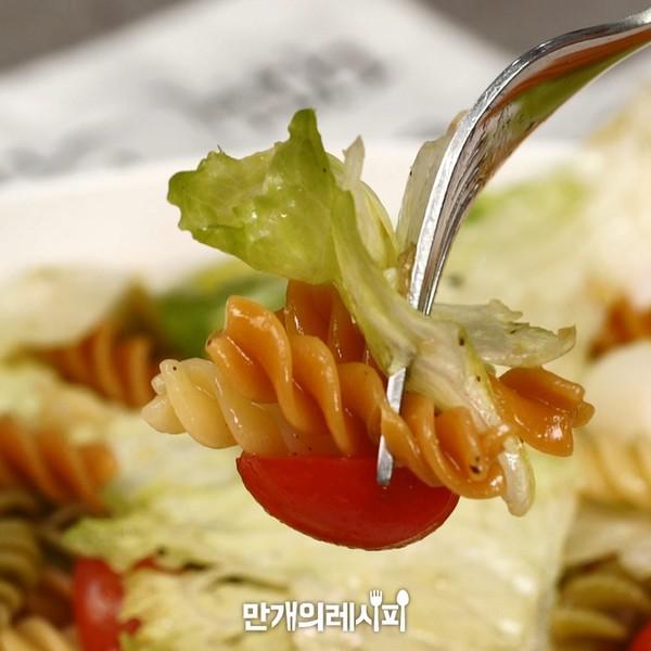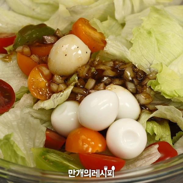 在碗里放入螺旋面,洋白菜,生菜,鵪鶉蛋,小西紅柿,醬汁攪拌后完成。