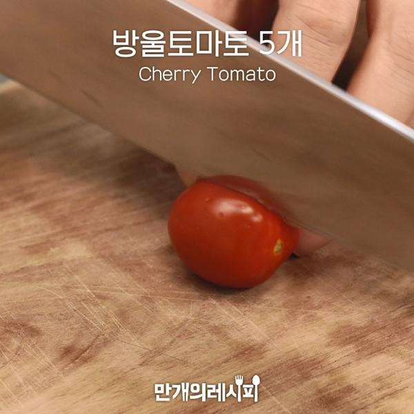 將洋白菜洗凈準(zhǔn)備,將小西紅柿切成兩半