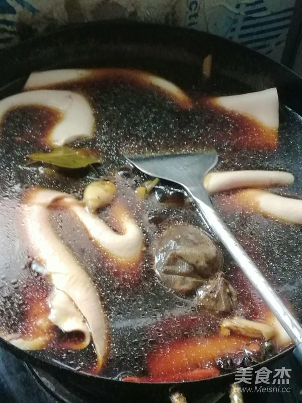 大火一直煮,不要蓋鍋蓋,大約30分鐘,中途不時翻動幾次!大致這樣的時候可以關(guān)火,讓煮熟的豬皮繼續(xù)浸泡在鹵水中,蓋上鍋蓋,浸泡20分鐘后,讓豬皮入味,直接開吃也行,想吃涼拌的,就自己調(diào)些涼拌用的汁,味道也是別有一番風味!